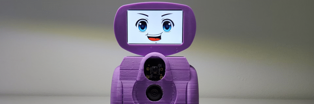 El robot desarrollado en nuestro equipo cuenta con micrófono, altavoces y una interfaz amigable, que simula expresiones faciales, con el fin de facilitar la comunicación con los pequeños.